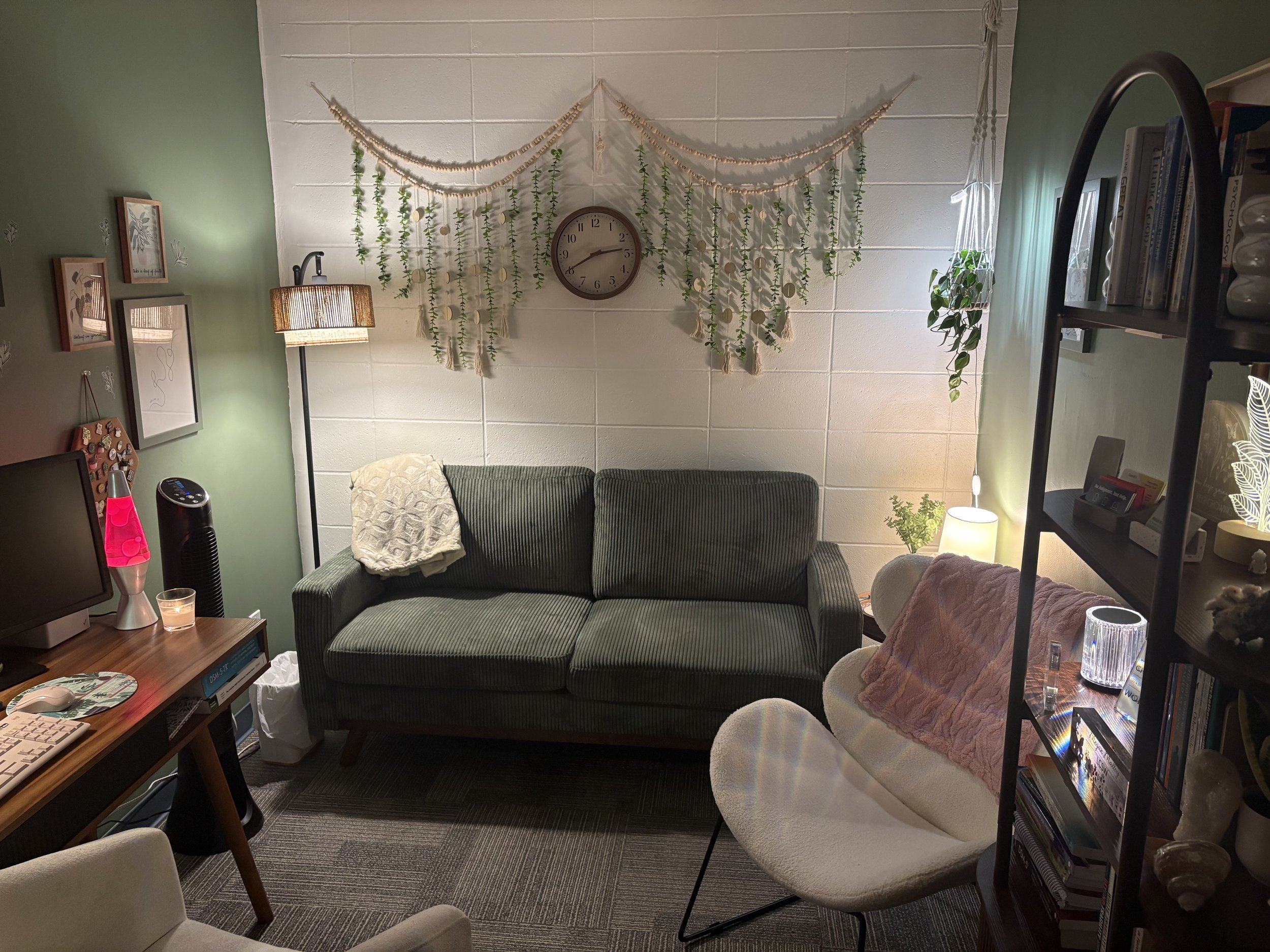 I welcome you to join me in my calming office space. Feel free to come hang out by the water fountain, take a relaxing break before or after your session, & enjoy the beautiful courtyard with benches & covered tables for a quick bite or favorite drink.